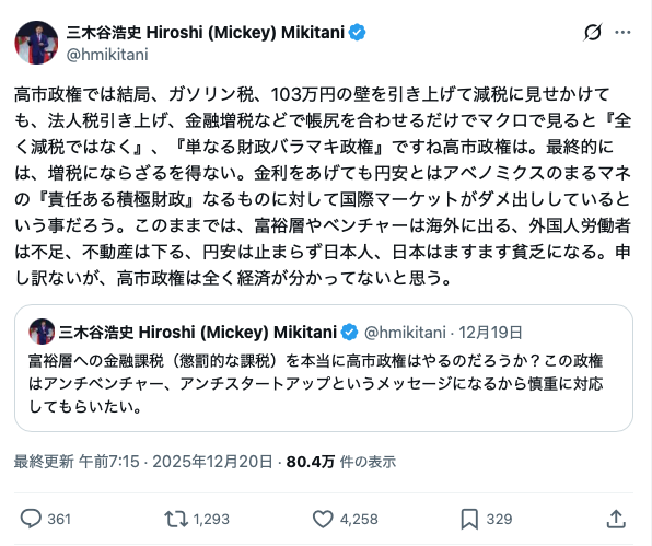 三木谷浩史「高市政権は全く経済が分かってない」