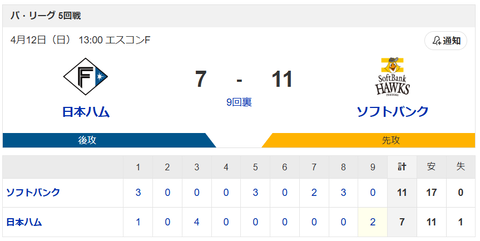 日本ハム、ソフトバンクに24年ぶり開幕5連敗