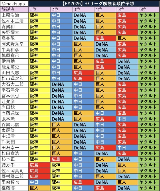 【セリーグ】ヤ-神-===巨-//=横-=広===中【4/19】