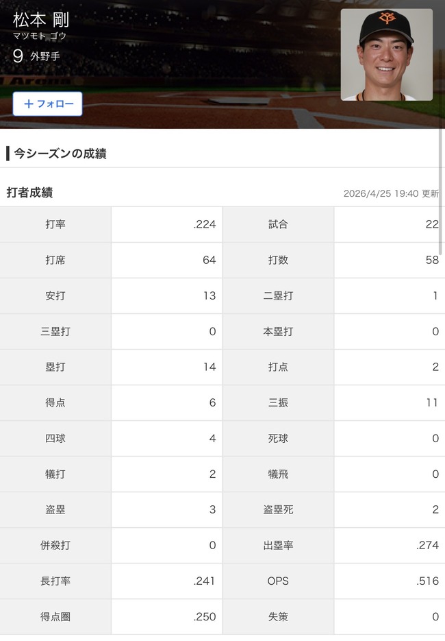巨人松本剛さん、なんか普通に戦力になる